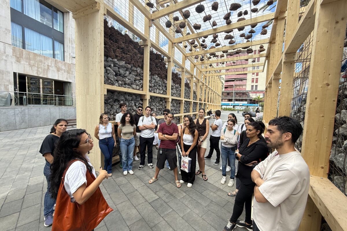 Después de la Semana de la arquitectura, donde uno de los coautores del proyecto ganador del TAC 2025 en la ciudad de Las Palmas de Gran Canaria, Don Alejandro Carrasco Hidalgo presentó el proyecto en coferencia, el viernes 31 de Octubre él y otros cooatores nos acompañaron a alumnos que asistieron a la conferencia al pabellón. El pabellón De Roca Madre responde a una doble intención: por un lado, mirar al pasado, evocando la construcción tradicional canaria en piedra y madera, con materiales geológicos y naturales propios de la isla; por otro, abrir una conversación crítica con una problemática contemporánea —la acumulación de residuos y microplásticos en las costas de Gran Canaria, en su mayoría arrastrados por las corrientes transoceánicas desde otros puntos del planeta.